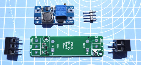 The step-up converter is an off-the-shelf DC-DC converter board using the MT3608. This can take an input voltage of 2-24V DC and supply an output voltage up to 28V DC. Up to 1A can be supplied, with peak of 2A.