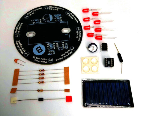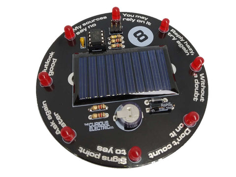 When you shake and wake the unit, the eight LEDs around the edge of the PCB will glow in sequence and slowly stop on one of eight ‘answers’ to your questions. These are taken from the classic 8 ball, but we have added a solar power twist to this DIY electronics kit.